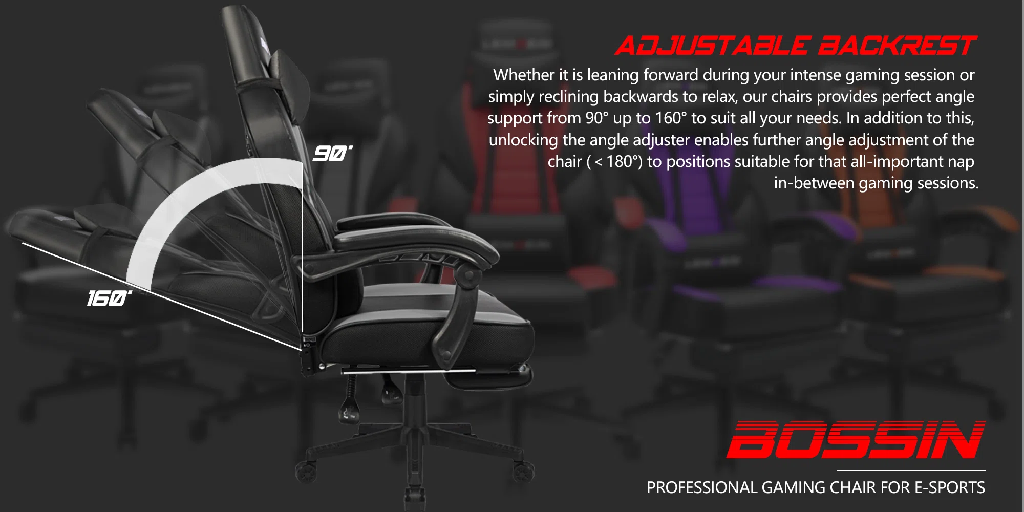 The Bossin gaming chair is designed for your every need! The gaming chair matches all locations. 360° Swivel and smooth racing caster wheels for mobility; 90°-180° reclining for working, gaming, reading, or napping; retractable footrest for relaxing; adjustable seat height, 400 lbs. capacity; head pillow and lumbar pillow for all body shapes. The winged back provides multi-point body contact to share the pressure and save your spine and lumbar with ergonomic back and massage support. Lean your legs more comfortably with a bucket seat design. The side wing frame has been thinned and contains a more soft filling. Alloy frame covered in quality PU leather and 6 inches of high-density foam for comfort. It is stable enough to serve for years.