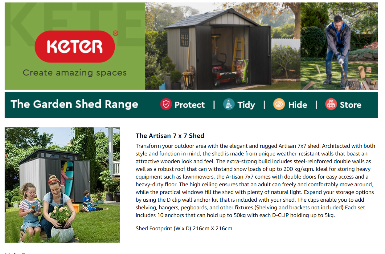 • Keter Artisan Outdoor Pent Double Door Garden Storage Shed 7 x 7ft Grey Duotech+ Wood look and feel, Fade Free, All Weather Resistant, Safe and Secure, Zero Maintenance