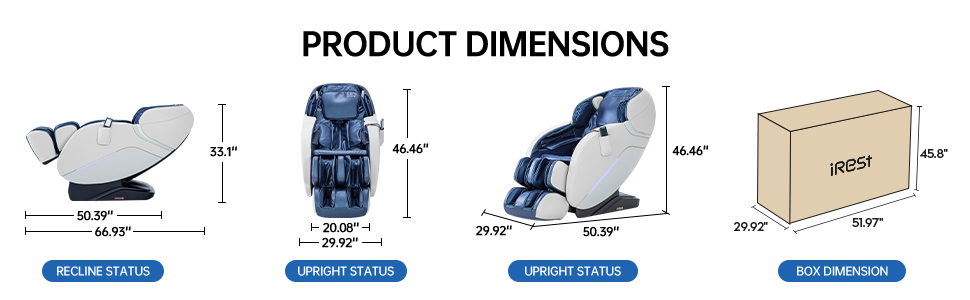 Product DimensionUpright status: 50.39"*29.92"*46.46" ; Recline status: 66.93"*29.92"*33.1"