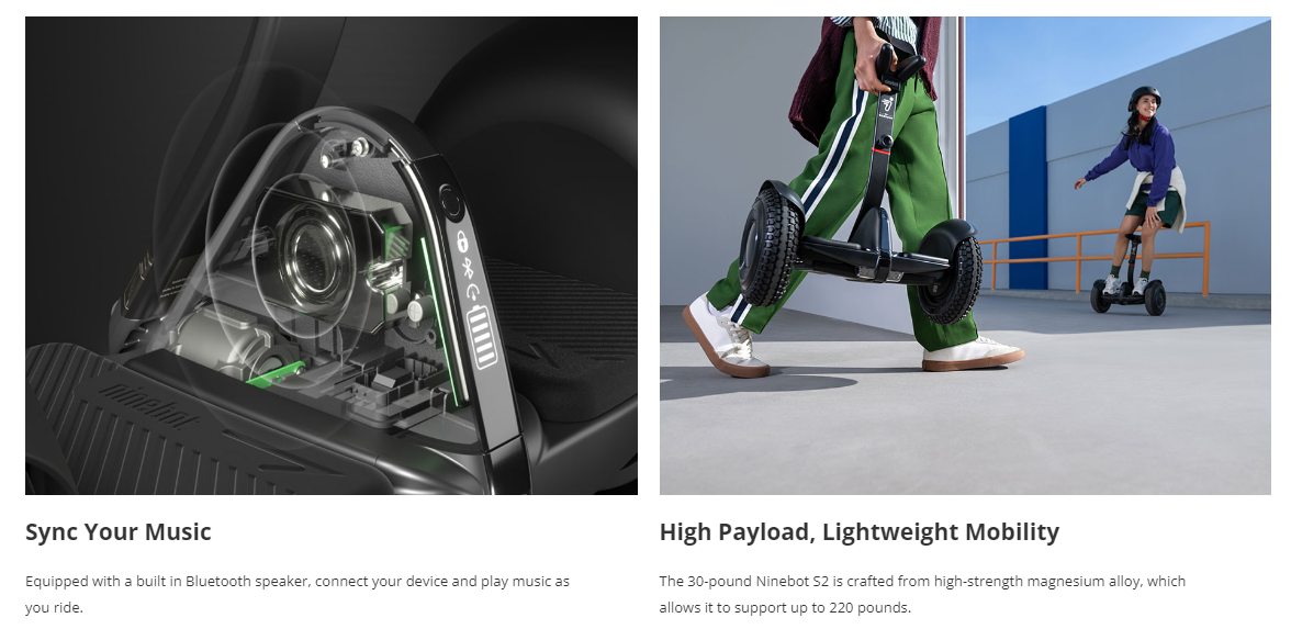 The Ninebot S2 offers the perfect self-balancing scooter experience for riders seeking both style and comfort. Whether teen or adult, users can easily adjust the knee control bar height to achieve a personalized fit. The RGB wheel lights and taillights can also be personalized to reflect individual mood and personality. With a built-in Bluetooth speaker, riders can sync their devices to pair the perfect playlist with a smooth ride.