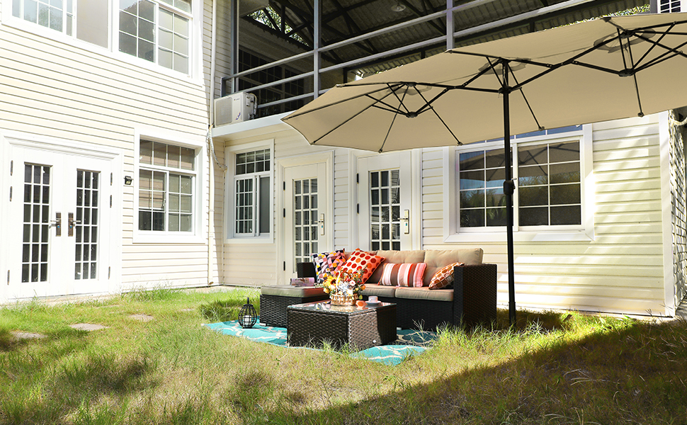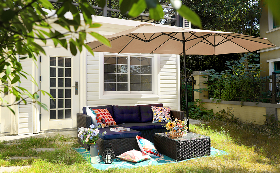 Humanized Design: Durable frame with e-coating for rust and weather resistant, stylish metal table design will brings aesthetic feeling to your patio, lawn, garden. Umbrella is easy to open and close with crank design. Extra large 13ft x 6.5ft double-sided canopy provides you with more shading area. Suggest opening the umbrella after it has been fixed to the base