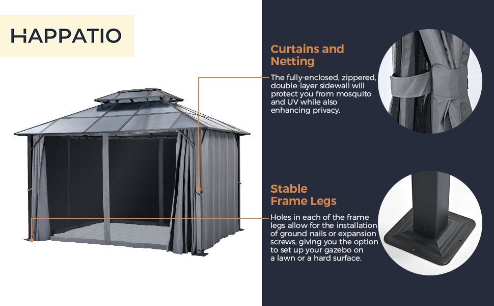 NETTING & CURTAINS: Our double-hardtop gazebo sports a dual-slide design that features zippered, double-layered sidewalls. These sidewalls provide added protection ,include strong sunlight, UV,rain and Mosquito - and they enhance privacy too. Enjoy a safe, comfortable environment in your outdoor gazebo.
