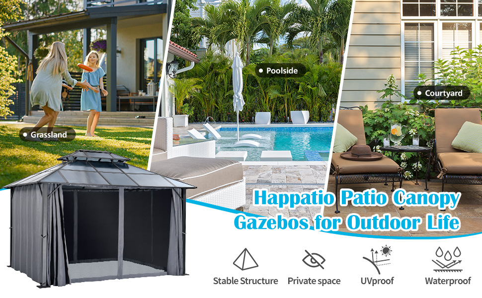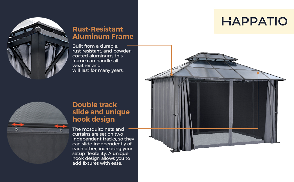 DOUBLE-LAYER POLYCARBONATE TOP: Our gazebos feature a double-layer polycarbonate roof. A double-layered hardtop allows for airflow and adds stability to the gazebo. Semi-transparent polycarbonate panels filter out 99% UVproof and help keep the gazebo cooler. All panels are also fade-resistant and built for all-weather use – that means you can enjoy outside time year-round.