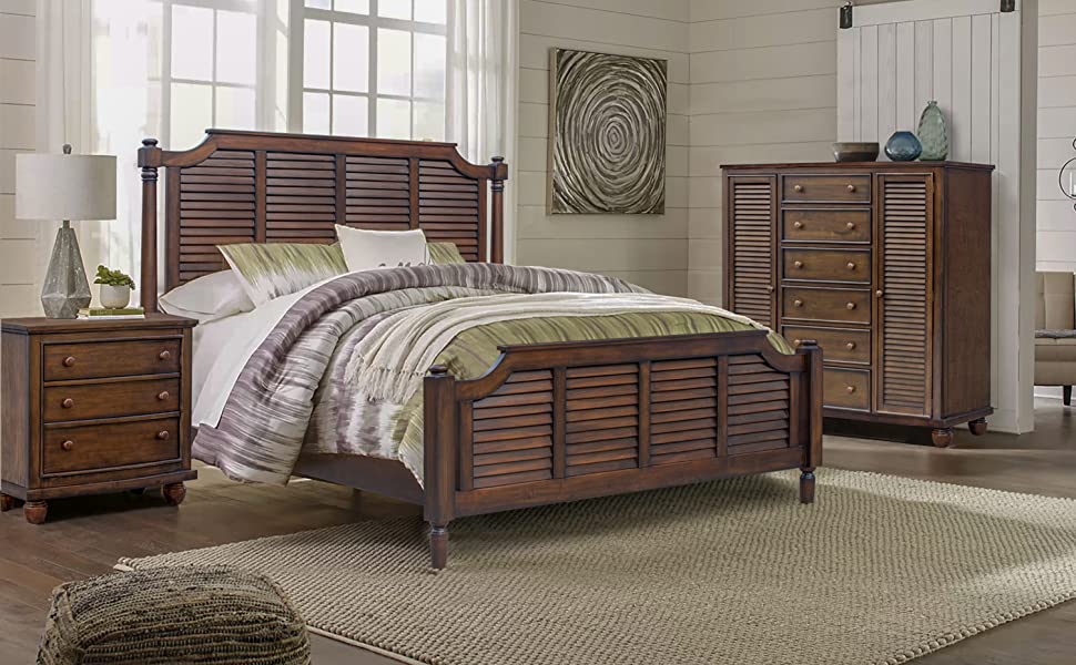 Wouldn’t it be nice to spend every night in paradise! Bring home the tropics, image a warm ocean breeze, a calm sailboat if you please, then returning to Sunset Trading’s Bahamas Shutter Bedroom Collection, relaxed and at ease. Casual angled louvers add depth and variation. You will sense the rich, organic excellence of solid Acacia wood, each piece oil rubbed by hand, exposing natural grains and distressing. Quality is in the details, this configurable bedroom set is ideal to make a spare bedroom in your bonus room using the matching room divider and armoire.