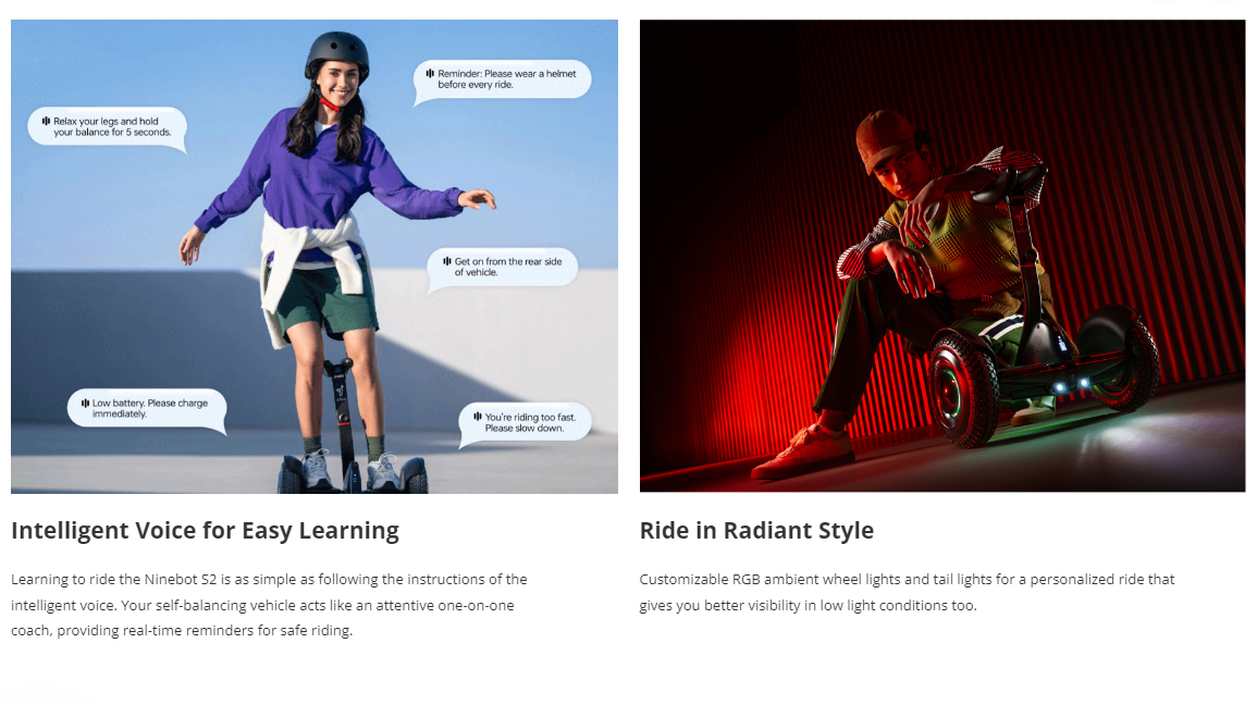 The Ninebot S2 offers the perfect self-balancing scooter experience for riders seeking both style and comfort. Whether teen or adult, users can easily adjust the knee control bar height to achieve a personalized fit. The RGB wheel lights and taillights can also be personalized to reflect individual mood and personality. With a built-in Bluetooth speaker, riders can sync their devices to pair the perfect playlist with a smooth ride.
